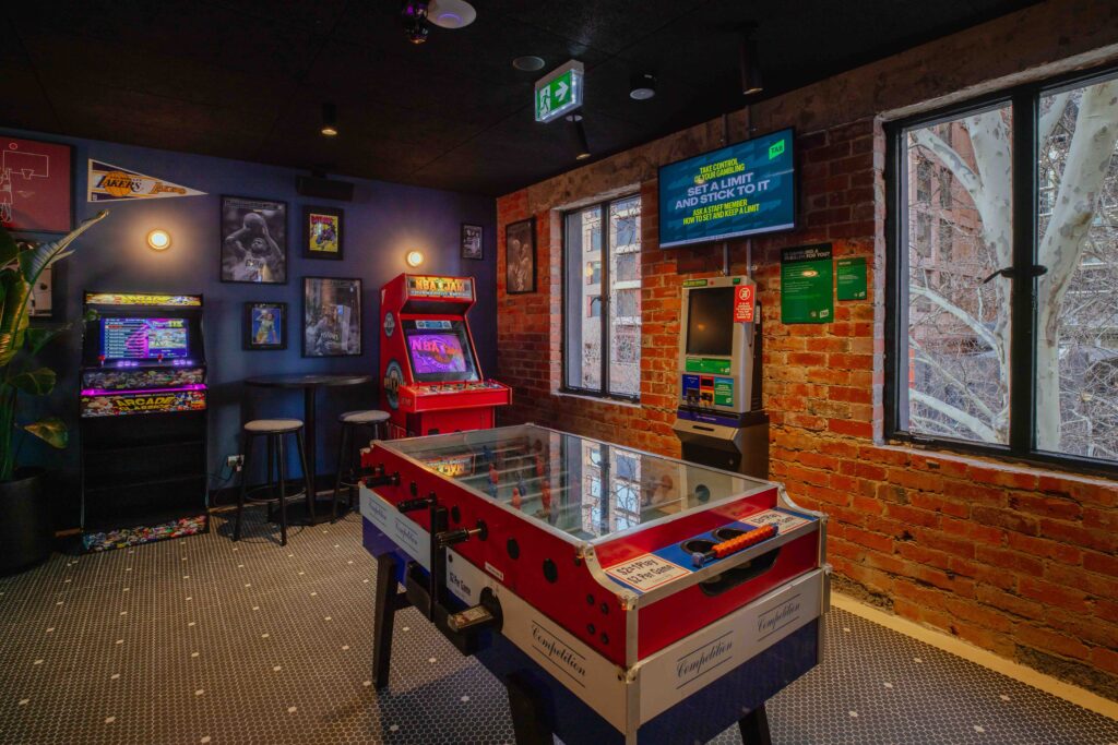 Level Two is all action. Dubbed Abe’s Athletic Hall, it’s a full-tilt sports and entertainment hub with massive screens, arcade games, karaoke rooms, foosball, booths and a deep love of live sport.