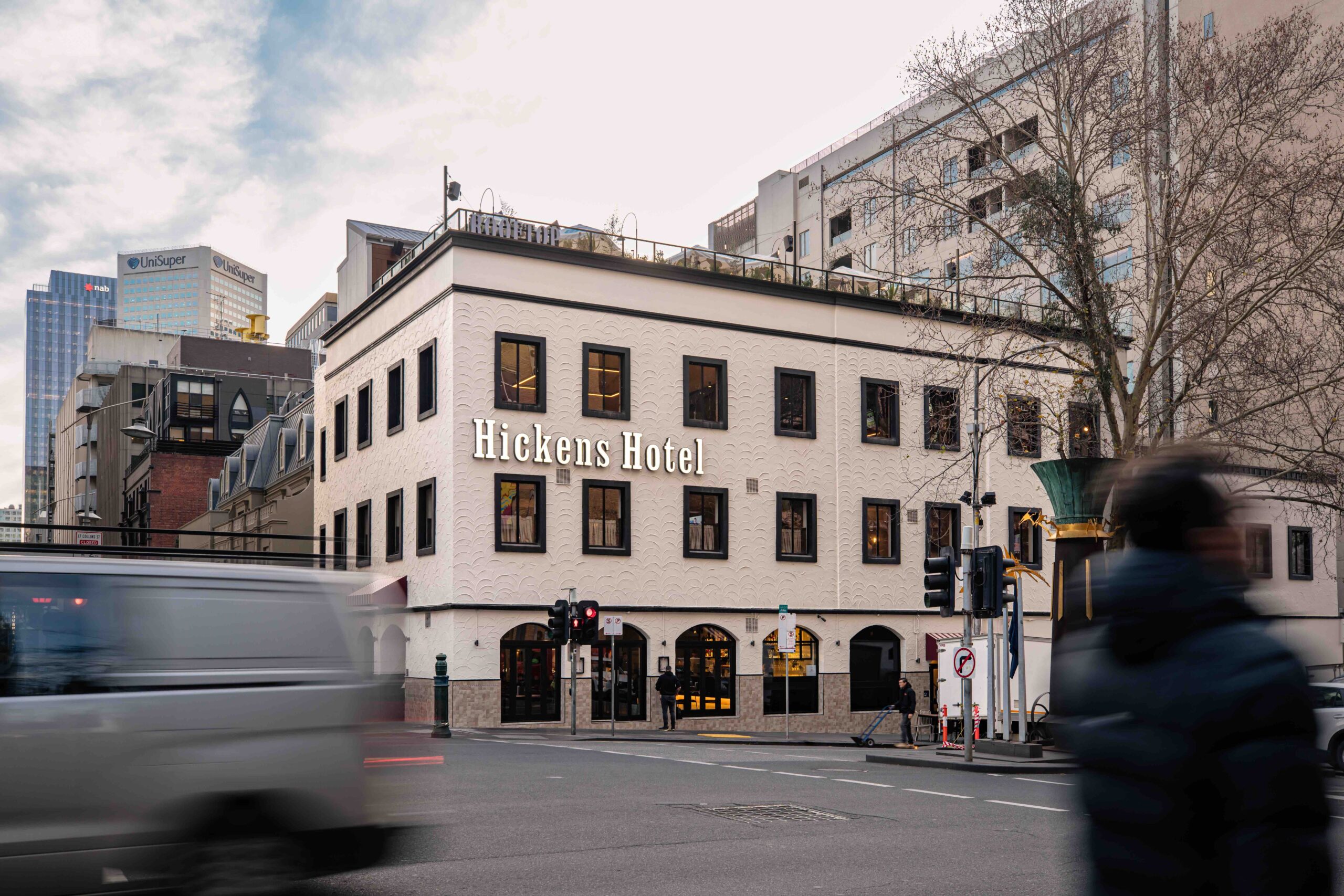 The corner of Russell and Little Collins has come back to life. After a $12 million transformation, a historic CBD pub has reopened as the Hickens Hotel – a four-level playground of nostalgic charm, rooftop drinks, retro sport culture and hearty pub eats.
