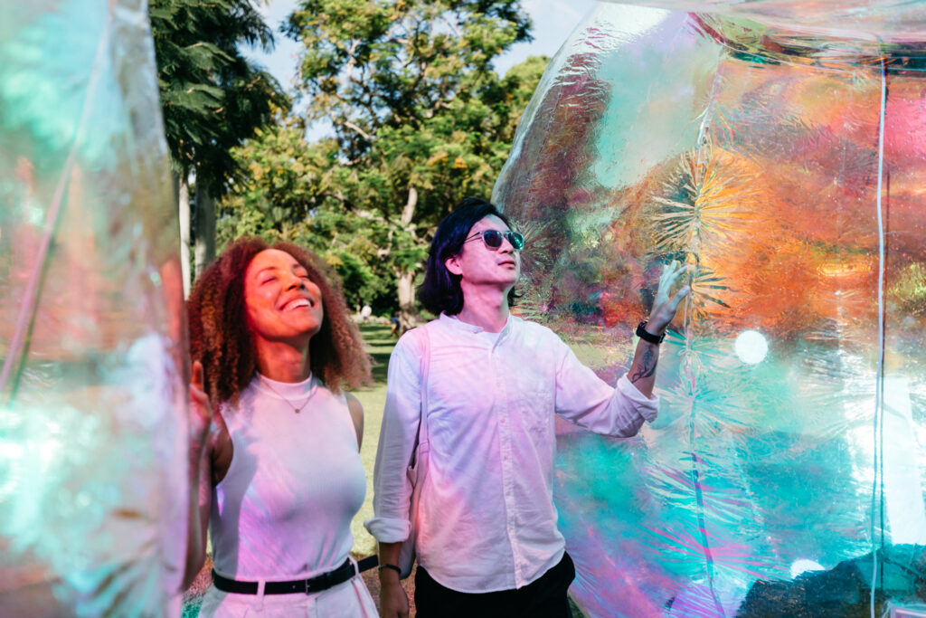 At the centre of the event is Ephemeral Collection by Sydney-based art and design studio Atelier Sisu. Towering up to 7.5 metres high, the work features enormous bubble-like forms made from dichroic film that refracts sunlight into a kaleidoscope of colours.