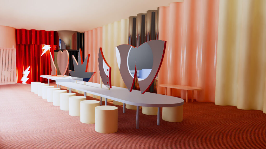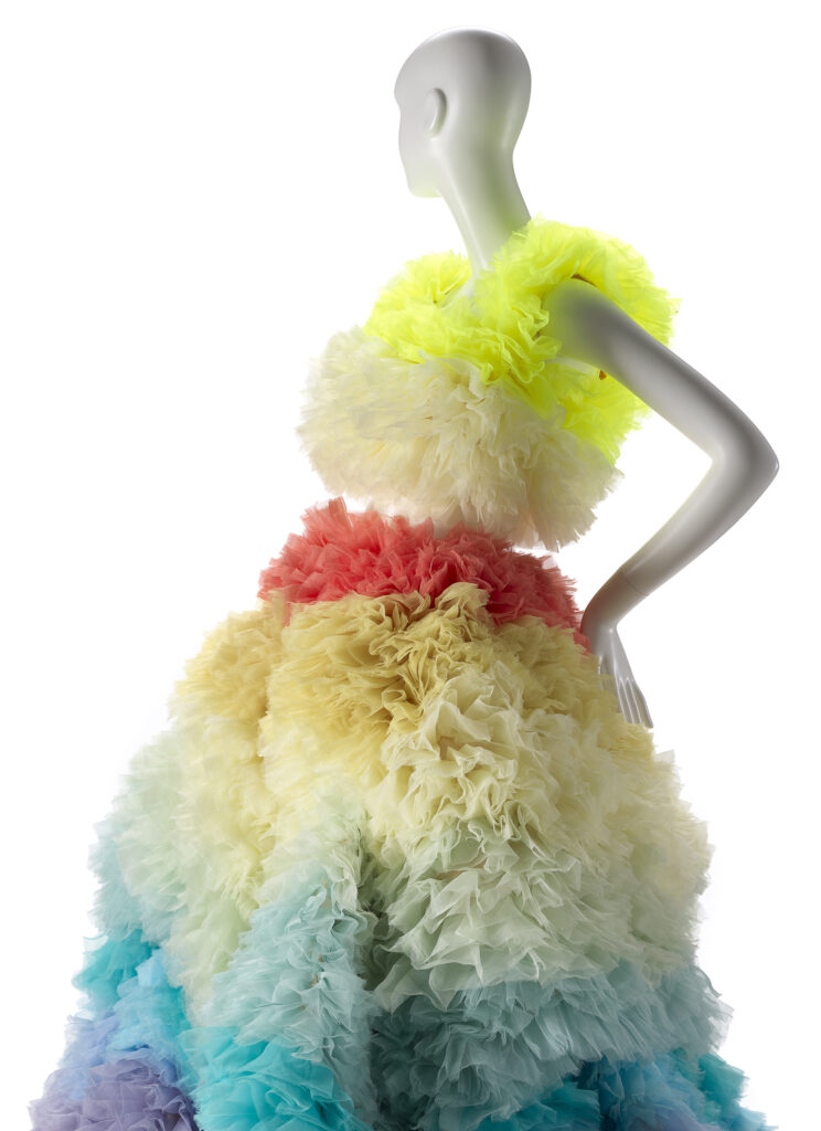 Designed by award-winning Australian designer Danielle Brustman, the gallery has been imagined as a theatrical and sensory space filled with glittering lights, bold colours and playful textures. Brustman, known for her vibrant interiors, drew inspiration from Japanese designer Tomo Koizumi’s exuberant Look 27 — a rainbow-hued ensemble made from 200 metres of ruffled organza.